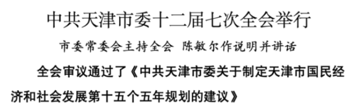 全会由市委常委会主持。市委书记陈敏尔作了讲话。全会审议通过了《中共天津市委关于制定天津市国民经济和社会发展第十五个五年规划的建议》。陈敏尔就《建议(讨论稿)》向全会作了说明。